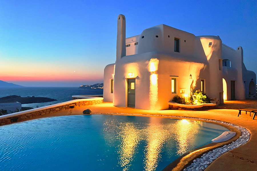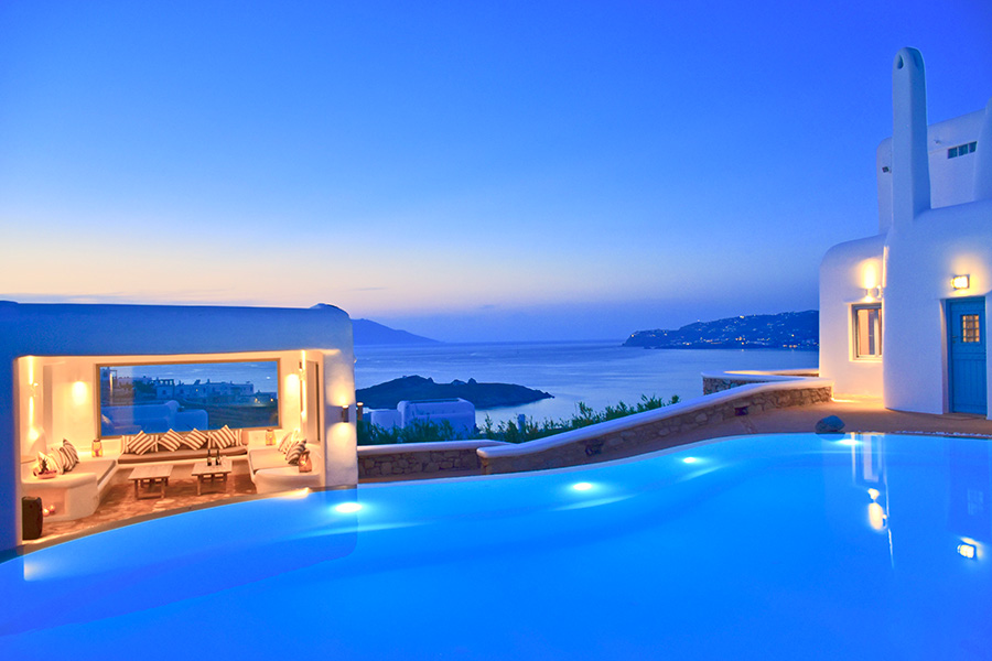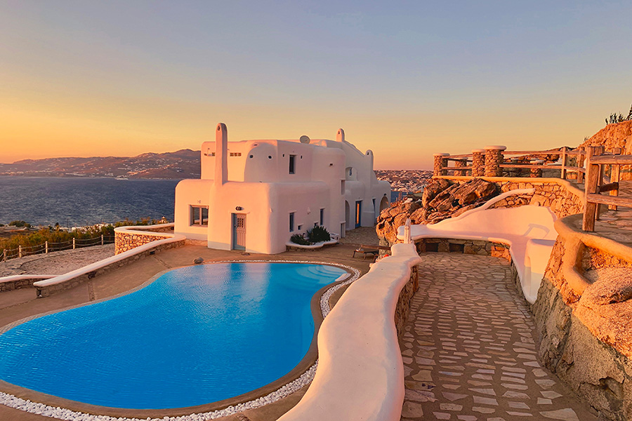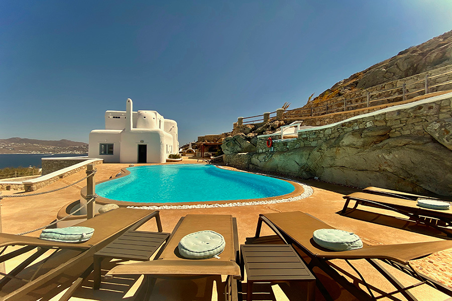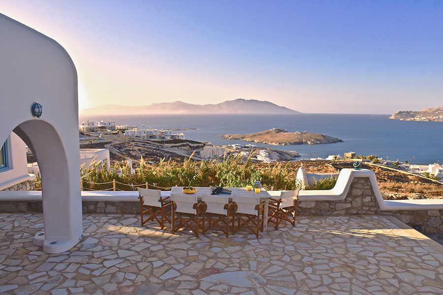 It is just a 15-minute drive from Mykonos Town and offers its guests the ultimate Mediterranean experience, with a superb panoramic view of the Aegean Sea, Mykonos Town, the Old and New port, 5 Cycladic Islands, plus breathtaking sunsets.