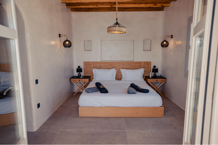 The second en-suite bedroom is 32,38 m2 with a private furnished balcony. The bedroom has South-East orientation and offers a unique sea view and view to Mykonos Town. The room provides a Queen size bed, one double open/closed closet with safe box, a 50’’ smart TV and a fully equipped bathroom as well as an indoor seating area for two.
