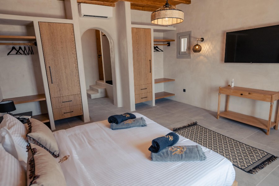 The spacious entrance floor accommodates superb living areas such as a living room with view to Mykonos Town, a TV room, a dining room, a fully equipped kitchen and a guest WC. In addition, in the entrance level there is a designed corridor that takes you in two of the rooms. On the upper floor there is an independent guest room with its own private entrance.