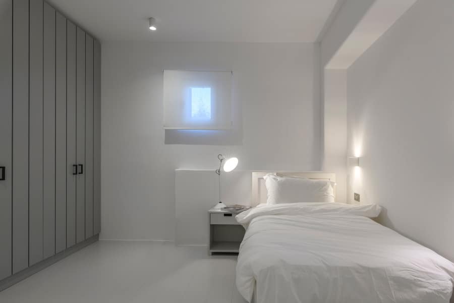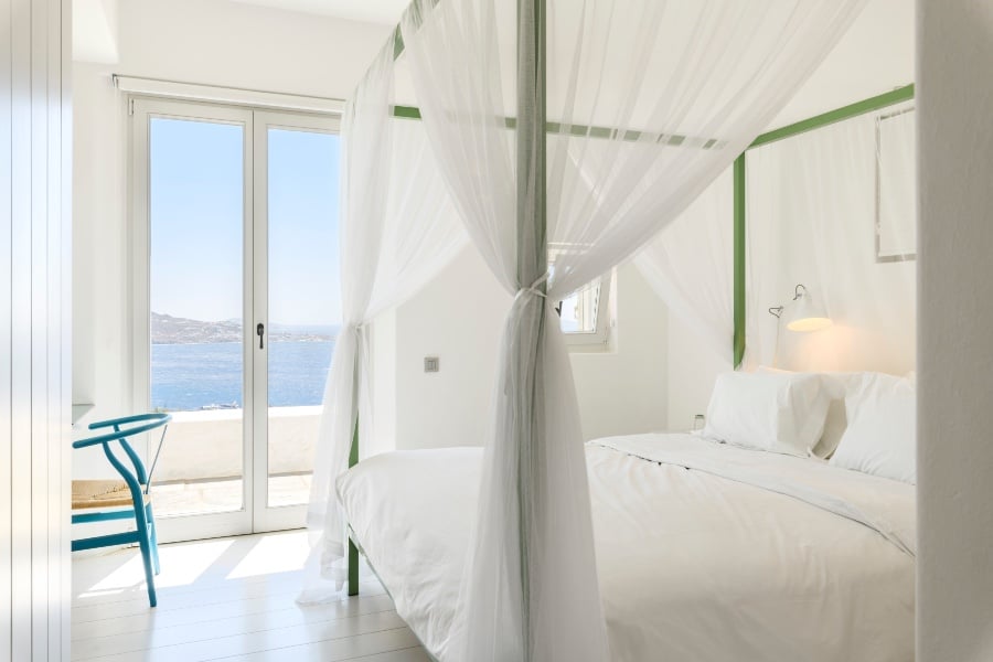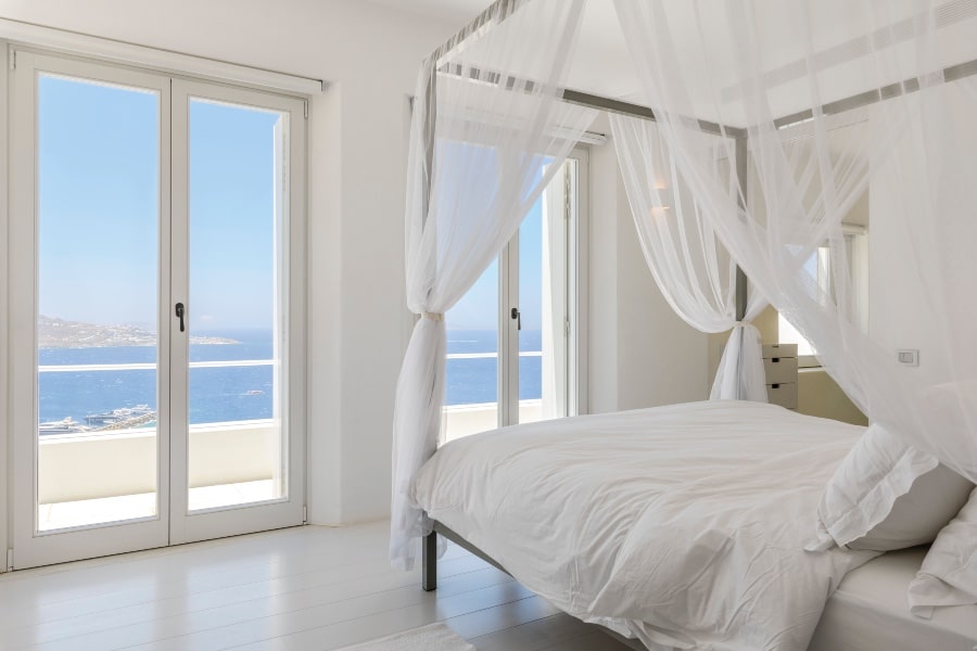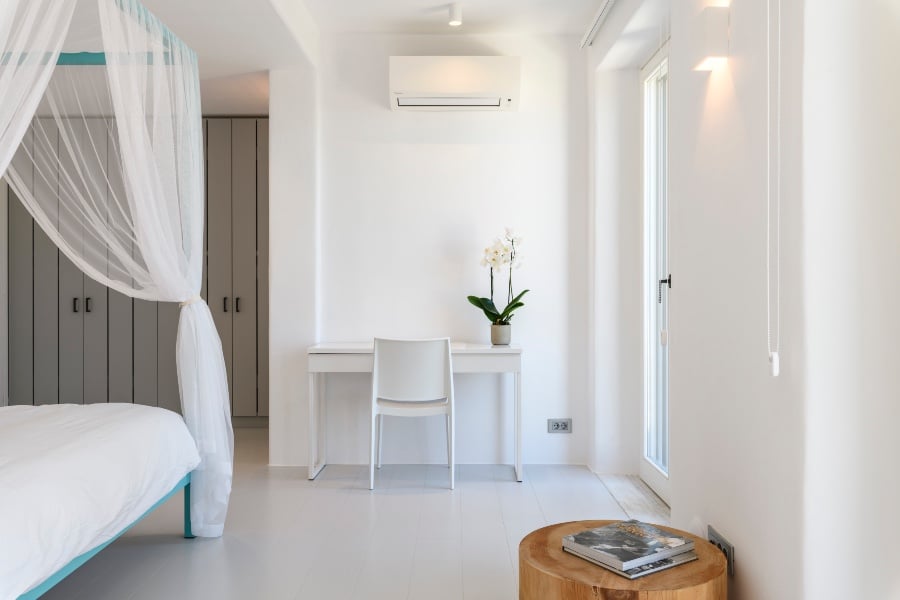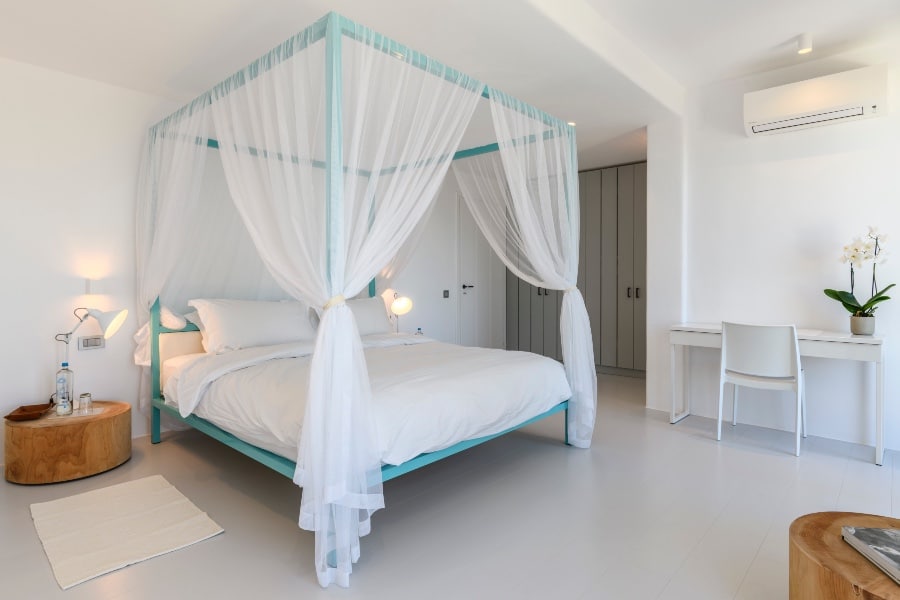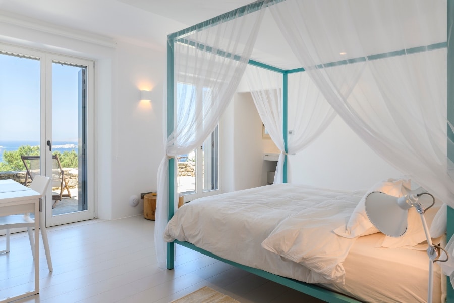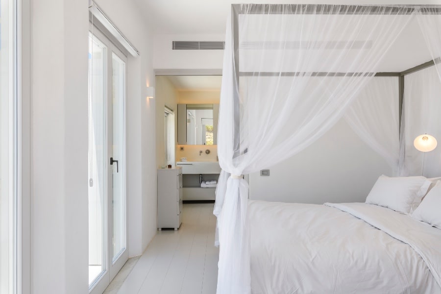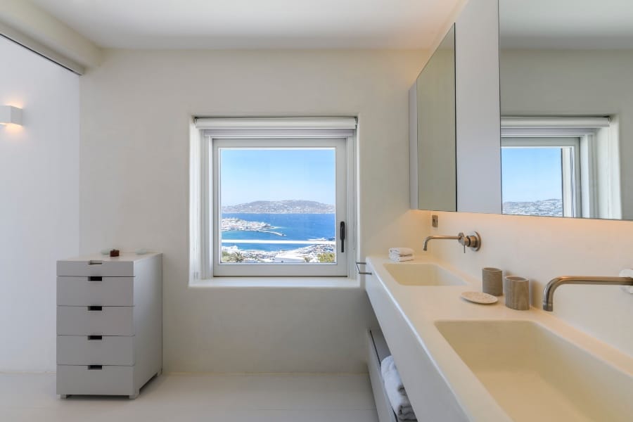 Guest Bedroom 1: (Bedroom 4): 24㎡ with ensuite bathroom (shower, toilet, single sink). The room has an independent door and a private furnished balcony while it has direct sunset view, view to Mykonos Town, the Old Port, the famous Windmills and Tinos Island. The room is equipped with one king size bed, wardrobe, A/C and safe box while is has a private balcony. Guest Bedroom 2: (Bedroom 5): 18㎡ with ensuite bathroom (shower, toilet, single sink). The room has an independent door it is equipped with one queen size bed, wardrobe, A/C and safe box while is has a private balcony.Exterior Area